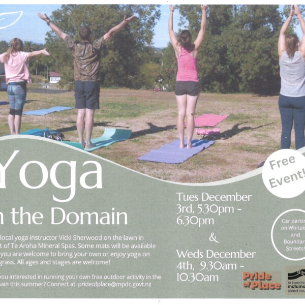 Join local YOGA instructor, Vicki Sherwood on the lawn in front of Te Aroha Mineral Spas. Some mats will be available and you are welcome to bring your own or enjoy YOGA on the grass. All ages and stages are welcome!